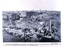 From the early 1840s, the wealthiest families of St. Louis often resided in enclaves on the outskirts of the city.[57] In the 1850s and 1860s, many wealthy businessmen lived along Washington Avenue, but the construction of the Eads Bridge encouraged commercial development in the area.[58] Other well-to-do areas included Lucas Place and Lafayette Square, which were developed in the 1850s and peaked in popularity in the 1870s.[58] Of Lucas Place, only the Campbell House remains extant after falling from popularity when the city divided a nearby park and connected the private street to the common grid.[59] Lafayette Square remained popular until the 1896 St. Louis-East St. Louis tornado, which killed more than 140 and destroyed dozens of buildings on the square.[60] Although some homes were rebuilt, many residents moved from the area, and by 1918 the area surrounding Lafayette Square was rezoned for commercial use.[60]
