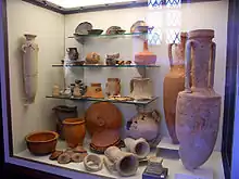 To the third phase, datable between the 8th and 6th centuries B.C., belong the tombs of S. Pietro in Campo, just west of the Steelworks necropolis. The burials are all inhumation burials, and are particularly rich: the men's with iron weapons, including leaf spears, javelins, swords and daggers; the women's with lebetes, basins, drawing cups, amphorae, as well as fibulae. The ceramic material, which is much finer and more finely worked than that of the previous phase, is usually represented by a large vase, and one or more small vessels and other objects, such as cups and ollae, all laid in a single tomb. The metal and ceramic objects are both of foreign origin, especially Phoenician, Etruscan, Faliscan, and Picenian, as well as local, but always with typically orientalizing references in those dated to the seventh and sixth centuries BCE.