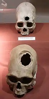 Trepanation, similar to some techniques used today, is the oldest surgical procedure known and was practised in the Stone Age in many parts of the world,[1] and in some areas may have been quite widespread. The main pieces of archaeological evidence are in the forms of cave paintings and human remains. One third of 120 skulls found at a site in France dating to 6500 BCE had undergone trepanning.[2] It was also practised widely in the pre-Columbian Andes.[3][4] These procedures were mostly performed on combatants, with evidence from skeletal remains revealing that the earliest methods usually resulted in death.[4] However, by the 1400s, Incas proved to be "skilled surgeons", as survival rates rose to about 90%, infection rates following the procedure were low and evidence was found showing that some individuals survived the surgery on multiple occasions.[4] Incan surgeons learned to avoid areas of the head that would cause injury, using a scraping method on the skull that would cause less trauma.[4] They also likely used medicinal herbs of the time, such as coca and alcohol for pain while balsam and saponin would be employed for antibiotic purposes.[4]