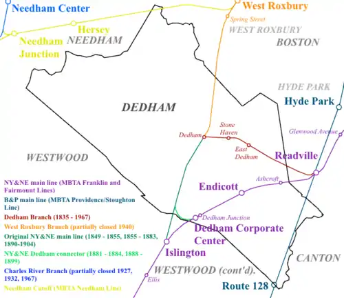 In 1881, the NY&NE built a branch from Dedham Junction (near the modern station site) to Dedham to replace the Norfolk County's original route to Dedham. This allowed the railroad to (unsuccessfully) compete with the Boston and Providence Railroad's Dedham Loop for Boston-Dedham commuter traffic.[18] The branch was closed in 1884, but reopened in 1888 by state commission order. In 1890 a short leg allowing Dedham-Islington travel for the Old Colony Railroad's Wrentham Branch was opened; trains using this route skipped Dedham Junction station. By 1898, the NYNH&H had acquired the Old Colony, NY&NE, and the Boston & Providence. With the NYNH&H having no need for four routes to the small town of Dedham, the southern branch was soon abandoned. Service south of Dedham via Dedham Junction ended in 1899 and via Islington in 1904.[18]