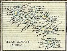 - ↑ The islands of Flores and Corvo were discovered by Pedro Vasquez de la Frontera and Diogo de Teive in 1452, during their return from voyages to the west, usually attributed to other discoveries or from fishing in the Terra dos Bacalhaus (the name attributed to the eastern coast of Newfoundland in Canada.
