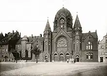 Königsberg's Jewish community flourished during the 19th century and early 20th century, peaking with a population of 5,000 by 1880.[7] The first history of the city's Jews was written by Heymann Jolowicz in 1867.[8] In 1893 the Adass Jisroel, an Orthodox branch, opened their own synagoge on Synagogenstraße near the Alte Synagoge. The Orthodox numbered only 25-30 families, but included influential bankers, merchants, and jewelers.[9] The liberal Neue Synagoge (new synagogue) was built along Lindenstraße in Lomse from 1894 to 1896 to serve the majority of the Jewish population. A third group included the city's Polish and Lithuanian Jews. The number of Russian Jews increased in the late 19th century due to anti-Jewish pogroms in the Russian Empire. Königsberg's Jewish citizens were divided between Zionists and the Centralverein deutscher Staatsbürger jüdischen Glaubens.[10]