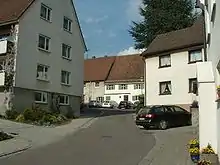 The settlement of the Jews in Laupheim developed on the so-called Judenberg ("Jews’ mountain" or rather "Jews’ hill") with the Judengasse ("Jews’ Lane") at its centre, a ghetto-like area, separated from the rest of the town, yet in close proximity to the market square. The Judenberg forms a regular square where the 8 oldest houses, arranged in 3 rows, are positioned parallel to one of the main streets leading away from the town centre.[10] The local Jews were allowed to influence the planning and design of their houses from the end of the 18th century onwards. It is remarkable, even today, that all houses are approachable from the front as well as the back, and that even the front yards and front gardens are not fenced in. The reason for this lies in the fact that the Judengasse was meant to incorporate the whole Jewish settlement to form an eruv.[19]