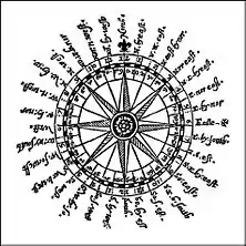 In 1300, an Arabic treatise written by the Egyptian astronomer and muezzin Ibn Simʿūn describes a dry compass used for determining qibla. Like Peregrinus' compass, however, Ibn Simʿūn's compass did not feature a compass card.[6] In the 14th century, the Syrian astronomer and timekeeper Ibn al-Shatir (1304–1375) invented a timekeeping device incorporating both a universal sundial and a magnetic compass. He invented it for the purpose of finding the times of prayers.[67] Arab navigators also introduced the 32-point compass rose during this time.[68] In 1399, an Egyptian reports two different kinds of magnetic compass. One instrument is a “fish” made of willow wood or pumpkin, into which a magnetic needle is inserted and sealed with tar or wax to prevent the penetration of water. The other instrument is a dry compass.[64]
