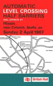 By January 1968 there were 207 automatic crossings in Britain including the one at Hixon, which had been converted to automatic half-barrier operation in July 1967.[3] Incidentally, Hixon was only eight miles (13 km) from the pioneering installation at Spath.