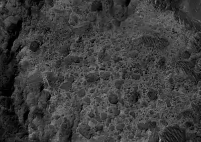 The crater's rim is cut with gullies, and at the end of some gullies are fan-shaped deposits of material transported by water.[5] The crater is of great interest to scientists because it has some of the best-exposed lake deposits. One of the layers has been found by the Mars Reconnaissance Orbiter to contain clays.[6][7]
