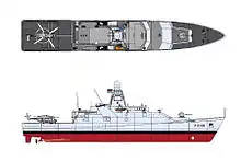 The ships are built to a design that is intended to reduce the ability of radar to detect them,[4] as well improving seakeeping by locating the superstructure unusually far aft.[13] The ships are painted a new light blue-gray color, which supposedly has a better camouflage-effect than the standard light-grey paint used by other RNLN ships. The ships have a hangar and flightdeck for an NH-90 helicopter[4] and also carry two Fast Raiding Interception Special forces Craft (FRISC), with a speed of more than 40 knots (74 km/h; 46 mph).