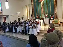 The Holy Family Catholic Church is a Catholic church located in Artesia, California. Established in 1930, it holds masses in English, Spanish, Tagalog, Portuguese, and Mandarin Chinese.[1] It is named after the Holy Family of Jesus and is a part of the San Pedro Pastoral Region in the Archdiocese of Los Angeles. The church also contains a school, Our Lady of Fatima (OLF), named after one of Mary, mother of Jesus' titles.[1] As of 2014, it has over 15,000 active parish members[3] and 80% of the mass attendees are Filipino as of 2019.[2] Rev. John Ernesto Ma. Cordero, MMHC, currently serves as its pastor.[5] Its logo reads "Go, Therefore, and Make Disciples of All Nations...," quoting Matthew 28:19.