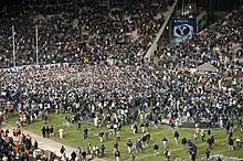 The Holy War is the name given to the American college football rivalry game played annually by the Brigham Young University (BYU) Cougars and the University of Utah (U of U) Utes.[5] It is part of the larger BYU–Utah sports rivalry. In this context, the term "Holy War" refers to the fact that BYU is owned and administered by the Church of Jesus Christ of Latter-day Saints (LDS Church) and the U of U is a secular, public university with a substantial LDS student population. The current president and head football coach at the U of U are also LDS Church members.[6]