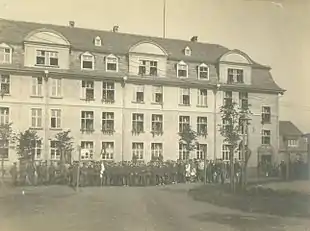 The camp occupied the premises of a cavalry barracks erected in 1913.[4] The principal buildings, in which the prisoners lived, were two four-storey barrack blocks, known to the Germans as Kaserne A and Kaserne B, and to the British as A House and B House. Although the greater part of both blocks housed officer prisoners, both were partitioned internally: the western end of Kaserne A formed the Kommandantur, in which the German garrison was quartered; while the eastern end of Kaserne B was occupied by the orderlies. The basements included cells in which prisoners could be held in solitary confinement as punishment. Several wooden single-storey buildings in front of the barrack blocks accommodated service facilities, including the cookhouses, woodshed, bath-house, and parcel-room.