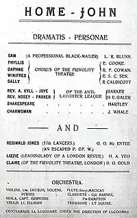 Cast list for "Home John", a revue performed in the camp on 27 July 1918. Erroll Sen appeared as "Winifred", and James Whale as "Charwoman".