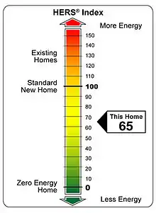Home energy ratings provide a relative energy use index called the Energy Rating Index (ERI).[1] An Index of 100 represents the estimated energy performance equivalent to a home built to the 2006 IECC standards and an Index of 0 (zero) indicates that the building uses no net purchased energy (a Zero Energy Building). The lower the value, the better.