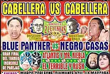 The storyline culminating in the main event match between Blue Panther and not just Negro Casas but the entire Casas family stretched back to the middle of the previous year as they build towards the Lucha de Apuestas hair vs. hair match between the two. In Lucha Libre the Luchas de Apuestas match is the ultimate payoff to a storyline and more often than not results in the conclusion of the storyline between the two. In late 2011 Blue Panther faced Negro Casas' brother El Felino in a Lucha de Apuestas match as the main event of CMLL's 2011 Sin Piedad (Spanish for "No Mercy") event. The match resulted in El Felino being disqualified for using the Piledriver, a move that causes an immediate disqualification in Lucha Libre. The loss meant that El Felino had to have his hair shaved off as a result.[7] Following the event Negro Casas stepped up to challenge Blue Panther, with the storyline explanation being that he wanted revenge from the "humiliation" of his brother at the hands of Blue Panther. Casas and Panther faced off extensively in the months prior to Homenaje a Dos Leyendas, most often on opposite sides of a six-man tag team match, the most common match form in CMLL. When the two finally wrestled in a one-on-one match the two went to a time limit draw with no clear winner of the match, giving neither man a clear advantage going into the Lucha de Apuestas match. As part of the build up to the event Panther and Casas engaged in a fight during the press conference for the contract signing, an event common in wrestling shows from the United States, but rare in Mexico.[8] Blue Panther was rumored to have been injured during the press conference altercation, putting the main event in question, but ultimately the match took place as scheduled.[9]