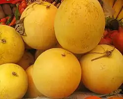 The honeydew melon is one of the two main cultivar types in Cucumis melo Inodorus Group.[1] It is characterized by the smooth rind and lack of musky odor. The other main type in the Inodorus Group is the wrinkle-rind casaba melon.[2]