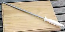 A honing steel, sometimes referred to as a sharpening steel, whet steel, sharpening stick, sharpening rod, butcher's steel, and chef's steel, is a rod of steel, ceramic or diamond-coated steel used to restore keenness to dulled blade edges. They are flat, oval, or round in cross-section and up to 30 centimetres (1 ft) long. The steel and ceramic honing steels may have longitudinal ridges, whereas the diamond-coated steels are smooth but embedded with abrasive diamond particles.[2]