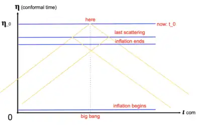 Note we use conformal time in the following diagrams. Conformal time describes the amount of time it would take a photon to travel from the location of the observer to the farthest observable distance (if the universe stopped expanding right now).