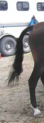 Tail hairs are also cut. "Clipping" the tail usually refers to trimming the sides of the dock, to a point about halfway down the dock. "Banging" the tail involves cutting the bottom of the tail straight at the bottom. In modern competition, this is usually done well below the hocks. Tail extensions, also known as "false tails," or "tail wigs," are false hairpieces which are braided or tied into the tail to make it longer or fuller.