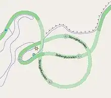 Map of Storegjeltunnelen and Dalbergtunnelen in Måbødalen gorge, a complex system of horseshoe curves, tunnels and loops on Norwegian National Road 7.
