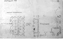 The plan of the complex has been handed down to us from the Renaissance drawings of Andrea Palladio and Giuliano da Sangallo,[25] while the remains of the cistern that fed it are still visible at the crossroads between the modern via Eleniana and via G. Sommeiller, made up of twelve chambers arranged in two parallel rows. In the Middle Ages, one of these rooms was turned into a Christian chapel of which fragments of frescoes were still preserved in the eighteenth century.