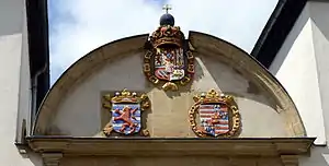 The main entrance of the Natural History Museum at no. 25 in rue Münster consists of a monumental portal between two Corinthian columns. In the gable of the portal there are three coats of arms. The upper one is the coat of arms of Charles II of Spain, who reigned in Luxembourg in 1674 when the hospice was rebuilt. On the left is the coat of arms of the Duchy of Luxembourg with the red lion. On the right is the coat of arms of Philip de Croy, the then Governor of Luxembourg.[2]