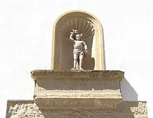 Under a niche with a statue of Saint Sebastian to the left of the entrance is a chronogram with the year 1674: