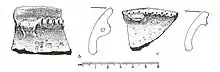 Langford trailed – represented by 3 rim and 7 body sherds; grit-tempered, globular vessels, rim profile vertical to outflaring, decorated from neck to shoulder with fine to wide incised lines or curvilinear patterns made using a stick or antler time. Decorations take the form of meandering parallel lines, nested arches and reed punctates. Lip sometimes notched or scalloped,. First reported from the Fisher site, Period B. Also found at the Zimmerman (Heally complex), Starved Rock, Plum Island and Gentleman Farm sites. Related to Grand River trailed in the Oneota Tradition. Time period: prehistoric. Cultural affiliation: Upper Mississippian.[1][2]