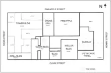 East of the Tower Building were the six-story Crosshall Building and the eight-story Pineapple Building. The Crosshall Building had a 50-foot (15 m) frontage on Pineapple Street, while the Pineapple Building was located at 60 Pineapple Street and had a 115-foot (35 m) frontage; both buildings were 90 feet (27 m) deep.[9] The easternmost 115 feet (35 m) of the block was the "St. George Hotel Building", the only operating portion of the hotel by the 1990s. The structure had a frontage of over 200 feet (61 m) on Henry Street, extending the entire block between Pineapple and Clark Streets; it rose eight stories on Pineapple Street and twelve stories on Clark Street. The hotel had entrances from Clark and Henry Streets, and the New York City Subway's Clark Street station was accessed from the lobby.[9]