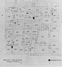 The House of Priests was excavated between 1929 and 1930 under French archeologist and Egyptologist Maurice Pillet, who was then Field Director of the excavation at Dura-Europos on the Syrian Euphrates, during the third expedition to the site.[2] Pillet's two assistants, André Naudy and Henry T. Rowell, took over the direction of the campaign after he fell ill and left the site in January 1930.[3] The excavations of block H2 were disturbed by heavy rains in January and February 1930, especially since the temples and the house were on a low level which left them susceptible to flooding. To remedy this, the team built an embankment southwest of the block to prevent flooding and subsequently rebuilt it three times.[4]