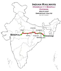 Bhopal–Howrah Express is a weekly express train operated by Indian Railways which runs between Rani Kamalapati railway station in Bhopal, the capital of the Madhya Pradesh state, and Howrah Junction railway station in Kolkata, the capital of the West Bengal state.
