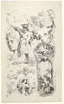 Gravelot was a mediocre student, who did not profit from a premature stay in Rome, financed by his father,[2] from which he returned, his funds depleted, without a stay in Lyon, an artistic center that often provided a stop-over for art students between Paris and Rome. Unsuccessful in a commercial venture at Saint Domingue on his father's account, he returned to Paris and became the pupil first of Jean II Restout, and then of François Boucher.
