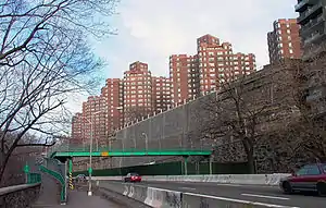 Pelham's son, George F. Pelham Jr., was the architect of Castle Village, on the other side of Cabrini Boulevard. This series of five buildings was finished in 1939 and converted to a co-op in 1985. On May 12, 2005 a large, 65-foot high retaining wall separating the Castle Village complex from the Henry Hudson Parkway collapsed onto the northbound lanes of the parkway and the 181st Street northbound on-ramp. Portions of the wall were nearly 100 years old according to records indicating the wall was constructed between 1905 and the 1930s.[46] The collapse lead to the on-ramp's closure for over two and half years; the entrance was reopened in March 2008.[47]