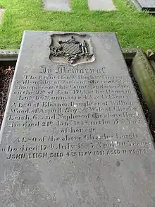 Hugh Willoughby died without issue on 22 January 1765 in London. Though a prominent dissenter, he was buried in the chancel of an earlier Horwich Church on 9 February 1765, the Church was rebuilt further away from the road in 1830, his grave is now within the current Parish Church graveyard .[2] He left his distant cousin, Henry Willoughby, heir to the barony, and property in Rivington and Anglezarke to his sisters, Helen Roscoe and Elizabeth Shaw. In memory of the family there is a monument at Rivington Unitarian Chapel. The Willoughby pew, bearing its original brass nameplate on the south wall of the chapel has been preserved and is noted for its large ornate canopy with panelled reredos and a moulded and carved cornice in the classical style.