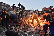Some Chinese personnel in Turkey assisted the rescue of several residents trapped by earthquake damage.[76][77] By 13 February, Chinese teams in Malatya had removed 25 residents from under the rubble, 9 of whom were still alive.[78][79] By 15 February, the Chinese team in Kahramanmaraş rescued 11 people before returning to China.[80][81] As of 18 February, 600 tons of aid from China had been sent to Turkey.[82]