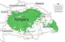 The Treaty of Trianon defined the current borders of Hungary and, compared against the claims of the pre-war Kingdom, post-Trianon Hungary had approximately 72% less land stake and about two-thirds fewer inhabitants, almost 5 million of these being of Hungarian ethnicity.[1][2] However, only 54% of the inhabitants of the pre-war Kingdom of Hungary were Hungarians before World War I.[3][4] Following the treaty's instatement, Hungarian leaders became inclined towards revoking some of its terms. This political aim gained greater attention and was a serious national concern up through the Second World War.[5]
