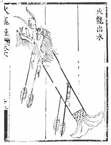 The Huolongjing also describes and illustrates the oldest known multistage rocket; this was the "fire-dragon issuing from the water" (huo long chu shui), which was known to be used by the Chinese navy.[34][35] It was a two-stage rocket that had carrier or booster rockets that would automatically ignite a number of smaller rocket arrows that were shot out of the front end of the missile, which was shaped like a dragon's head with an open mouth, before eventually burning out.[34][35] This multistage rocket is considered by some historians to be the ancestor of modern cluster munitions.[34][35] Needham says that the written material and illustration of this rocket come from the oldest stratum of the Huolongjing, which can be dated to about 1300-1350 from the book's part 1, chapter 3, page 23.[34]