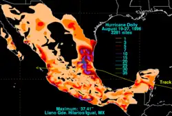 In Nuevo León, the storm caused four fatalities, including one in the city of Monterrey. The place with the most rainfall received in a 24-hour-period was in Micos, which observed 12.94 in (329 mm) of rain. Some other high rainfall recordings were in Santa Rosa, which recorded 10.59 in (270 mm), and Puerto de Valles, which received 10 in (254 mm) of rain.[1] Although well south of the storm's path, precipitation from Dolly peaked at 37.41 in (950 mm) in Iguala de la Independencia, Guerrero, making it the wettest tropical cyclone on record in Guerrero.[13] In Sinaloa, three fatalities occurred, two when two people stepped into a puddle of water electrified by a downed power line and another from a weather-related traffic accident.[14] According to newspaper reports, 14 people died in the storm's passage. An additional two people from Nuevo León were reported to be missing.[1]