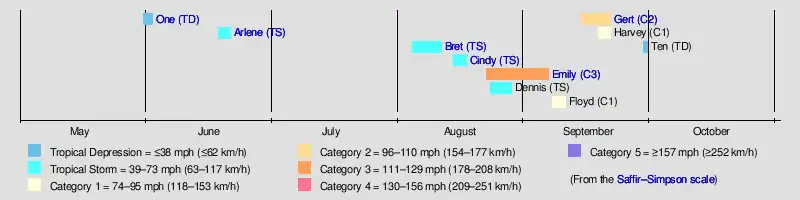 Hurricane GertHurricane Emily (1993)Tropical Storm Cindy (1993)Tropical Storm Bret (1993)Tropical Storm Arlene (1993)Tropical Depression One (1993)Saffir–Simpson scale