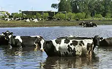 Additionally, Irene caused severe agricultural damage in southeastern Florida adding up to $338 million,[21] approximately $75 million of which occurred to crops alone in Miami-Dade County.[23] Impacts to crops and farming also accounted for the vast majority of Palm Beach County's overall damage total of about $100 million.[24] Floodwaters killed 30 cattle at one farm, though the owners protected the rest of their 1,700 cattle by raising the feeding areas above the flood plain.[25] According to an initial estimate, the flooding destroyed between 5% and 15% of fruit groves along its path.[26] The flooding delayed the winter planting of corn and bell peppers and damaged tomato plants, forcing Miami-Dade County growers to replant damaged crops.[27] The hurricane also damaged sugar cane, vegetables, and citrus crops,[28] with citrus canker spreading after the storm passed through the area.[29] A U.S. Sugar processing mill in Bryant suffered about $4 million in damage after winds demolished two cooling towers and toppled some of the facility's walls. The company also lost around 500,000 boxes worth of oranges, equivalent to roughly 90% of its orange crops.[30]