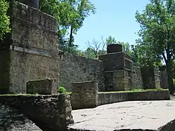 Hurstville was an industrial complex and a company town. It was a major lime supplier in the state of Iowa for masonry building and bridge construction in the Midwest.[2] Alfred Hurst built the first kiln in 1871, and the other three followed soon after. The whole operation grew to include 3,000 acres (1,200 ha) and 50 employees.[3] The property included timber, which was used in the kilns. Hurst organized the Maquoketa and Hurstville Railroad in 1888 to ship the burned lime instead of hauling it by wagon. The limestone was quarried to the east of the kilns across the North Fork of the Maquoketa River. It was brought to the kilns by way of a narrow-gauge railway. A bridge, which collapsed into the river in the 1970s, was built over the river around 1900. By the 1920s the increased use of Portland cement by the construction industry affected the lime industry. The last time all four kilns were used at the same time was 1920, and the kilns were shut down in 1930 when William Hurst, Alfred's son, died.[3]
