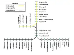 The Hyderabad–Lingampalli route (HL) is a rapid transit service of the Multi-Modal Transport System of Hyderabad, India. Spanning 13 stations, it runs between Hyderabad and Lingampalli 24 times a day.