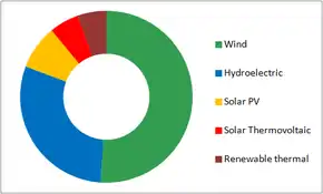 Spain, along with other European Union States, has a target of generating 32% of all its energy needs from renewable energy sources by 2030.[4] A previous target of 20% for 2020,[5] with an additional 0.8% available for other EU countries under the cooperation mechanism, was reached and slightly surpassed.[6][7][8] In 2021, renewables generated 46.7% of Spain's electricity needs, the largest part of it from wind power (23.3%), followed by hydroelectric (11.4%), solar (9.9%), and other renewables (2.2%).[9][10]
