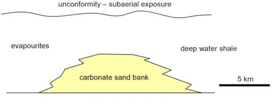 The deposits are hosted in limestone or dolomite that was deposited on shallow marine platforms in a tectonically stable intraplate environment. As expected in such an environment, volcanic rocks, folding and regional metamorphism are absent as a general rule. MVT deposits commonly lie in close proximity to evaporites and/or beneath unconformities.[43]