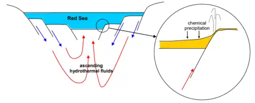 SEDEX deposits form in sedimentary basins under a regional tectonic extensional environment, under the ocean where cold seawater (blue arrows) is mixed with basin water and through sinsedimentary faults flow towards the bottom of the basin, which are heated by the geothermal gradient, and later ascends by convective currents (red arrows).[42]