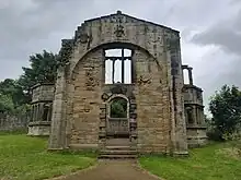 After a long period of remaining empty, the castle slowly began to decay, until in 1812, when Simon Temple, a local businessman, leased the castle from the Strathmores and made it habitable.[1] He re-roofed the chapel (allowing it to be used for public worship again), added battlements to the wings and cultivated the gardens.[1][19] However, his failed business ventures prevented him from completing his work, and in 1819 the castle was lived in by a Mr. Thomas Wade.[1][19]