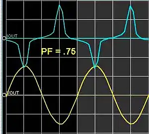 The result of mains rectifiers with connected large value smoothing capacitors is that mains current only flows in the peaks and valleys of the AC wave. Whereas a half cycle of the mains lasts for 10 ms, the mains current flows with large smoothing capacitors for only 3 ms. The result is that high peak currents flow during a short time. The power factor of such rectify and smooth apparatus may be as low as 0.6, and a large number of harmonics (3: 150 Hz), (5: 250 Hz) etc. are generated. This leads to much extra losses in the distribution network, especially in the neutral conductor of a 3 phase distribution network, since the 3rd harmonic of the R, S, and T phase are in phase with each other. The resulting neutral conductor can be larger than the current in each of the phases R, S and T. The sinusoidal wave that the mains voltage should be is distorted and resembled in the days before the harmonic current standard was applicable to electronic apparatus, more a trapezoidal wave: The tops and valleys of the sine wave were flattened.