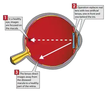 It is a procedure to give symptomatic relief rather than treat disease and is best understood as an implanted miniature telescope.[2]