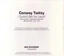 "I Couldn't See You Leavin'" is a song written by Ronnie Scaife and Rory Bourke, and recorded by American country music artist Conway Twitty. It was released in December 1990 as the second single from his album Crazy in Love. The song reached #3 on the Billboard Hot Country Singles & Tracks chart in 1991.[1] It was Conway's final Top 10 hit.