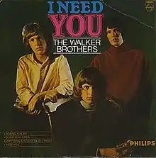 I Need You is an extended play by the American pop group The Walker Brothers. It was released in 1966 reached number one on the UK EP Chart.[2] It was released following the group's second UK #1 single when the group were at the height of their popularity.