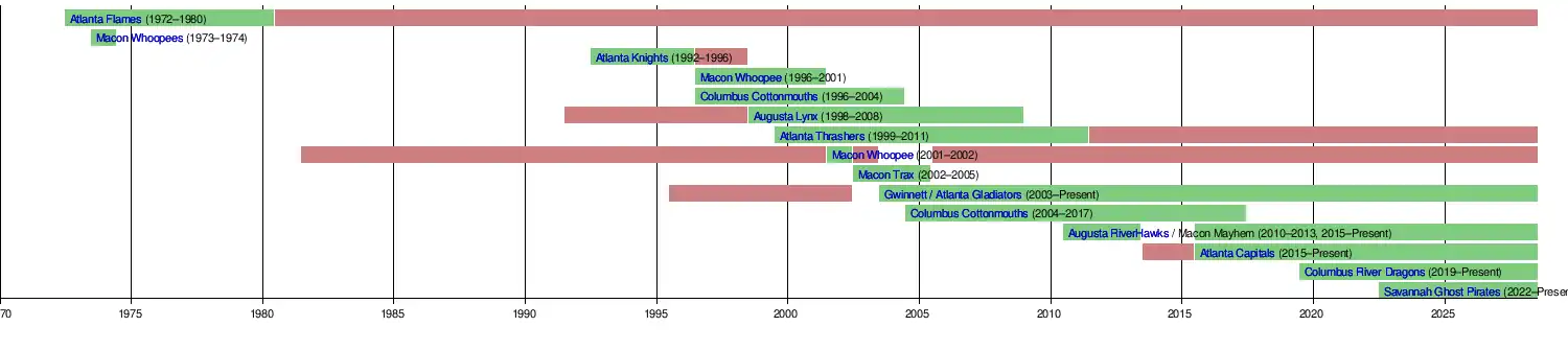 Savannah Ghost PiratesColumbus River DragonsAtlanta CapitalsAugusta RiverHawksColumbus CottonmouthsAtlanta GladiatorsMacon TraxMacon Whoopee (ECHL)Atlanta ThrashersAugusta LynxColumbus CottonmouthsMacon Whoopee (CHL)Atlanta KnightsMacon Whoopees (SHL)Atlanta Flames