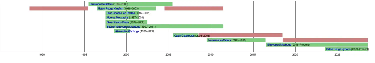 Baton Rouge ZydecoShreveport MudbugsLouisiana IceGators (SPHL)Cajun CatahoulasAlexandria WarthogsBossier-Shreveport MudbugsNew Orleans BrassMonroe MoccasinsLake Charles Ice PiratesBaton Rouge KingfishLouisiana IceGators (ECHL)
